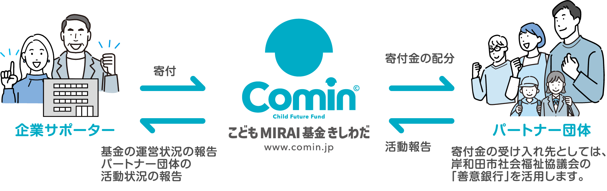 「こどもMIRAI基金きしわだ」では、岸和田のこどもたちのために活動している市民団体の取り組みを、団体のみなさんと一緒に経済人に広く伝え、企業からの寄付を募って、集まった資金を団体のみなさんにご活用いただきます。市民活動の現場で汗を流すみなさんと経済人が協力して課題の解決を図ることで、こどもたちの笑顔が増え、岸和田の未来を明るく照らしてくれることを願います。